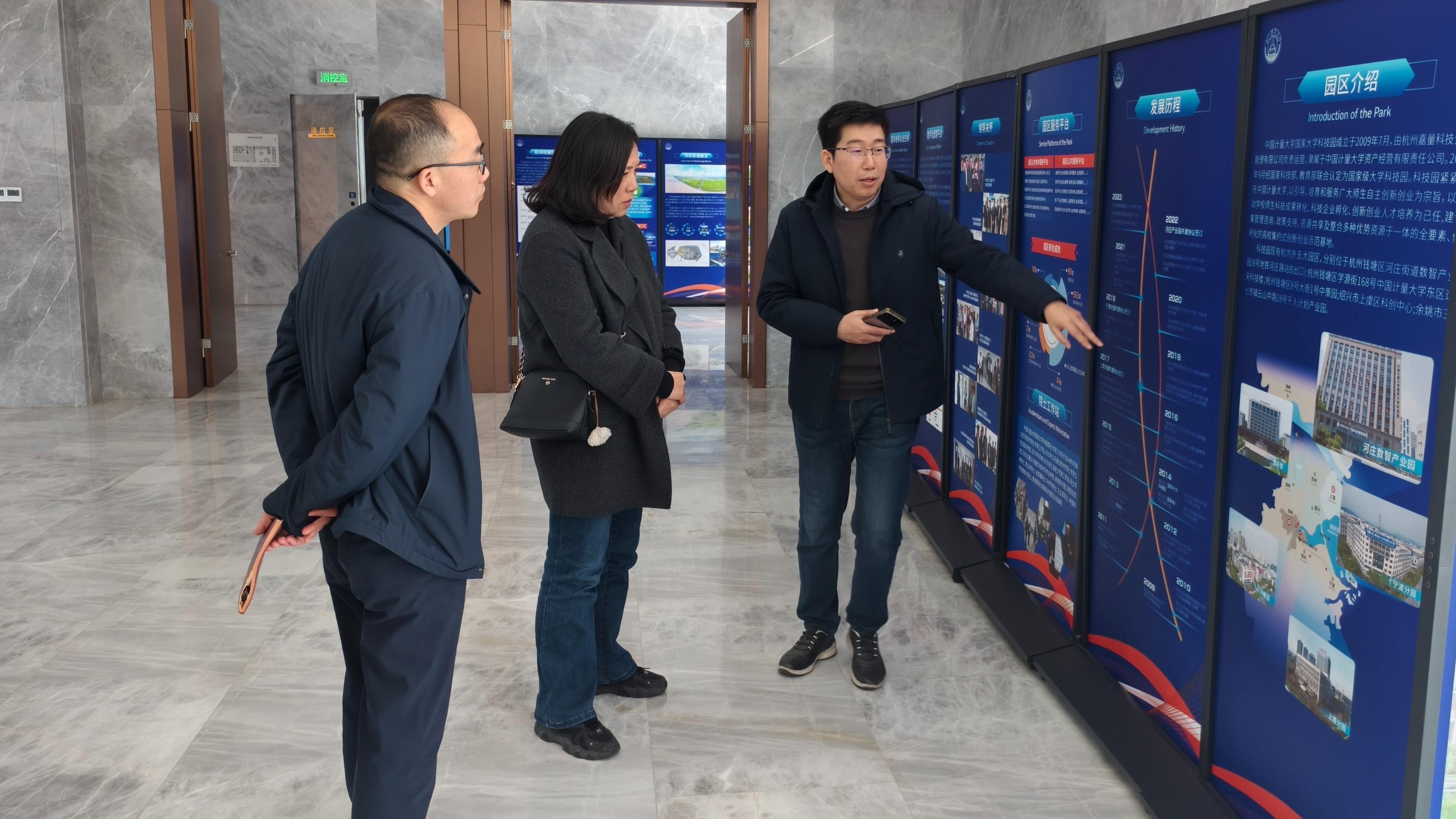 在方彬繁总经理的陪同下,科技园一行参观了该园区的孵化场地、公共服务平台及特色产业园区,详细了解其空间布局、基础设施和入驻企业发展情况,深入了解了园区在管理优化、运营重塑、资源整合等方面的具体做法。该园区依托中国计量大学学科优势,构建了全链条企业孵化体系,服务平台完善,在科技成果转化、高新技术企业培育等方面成效显著。